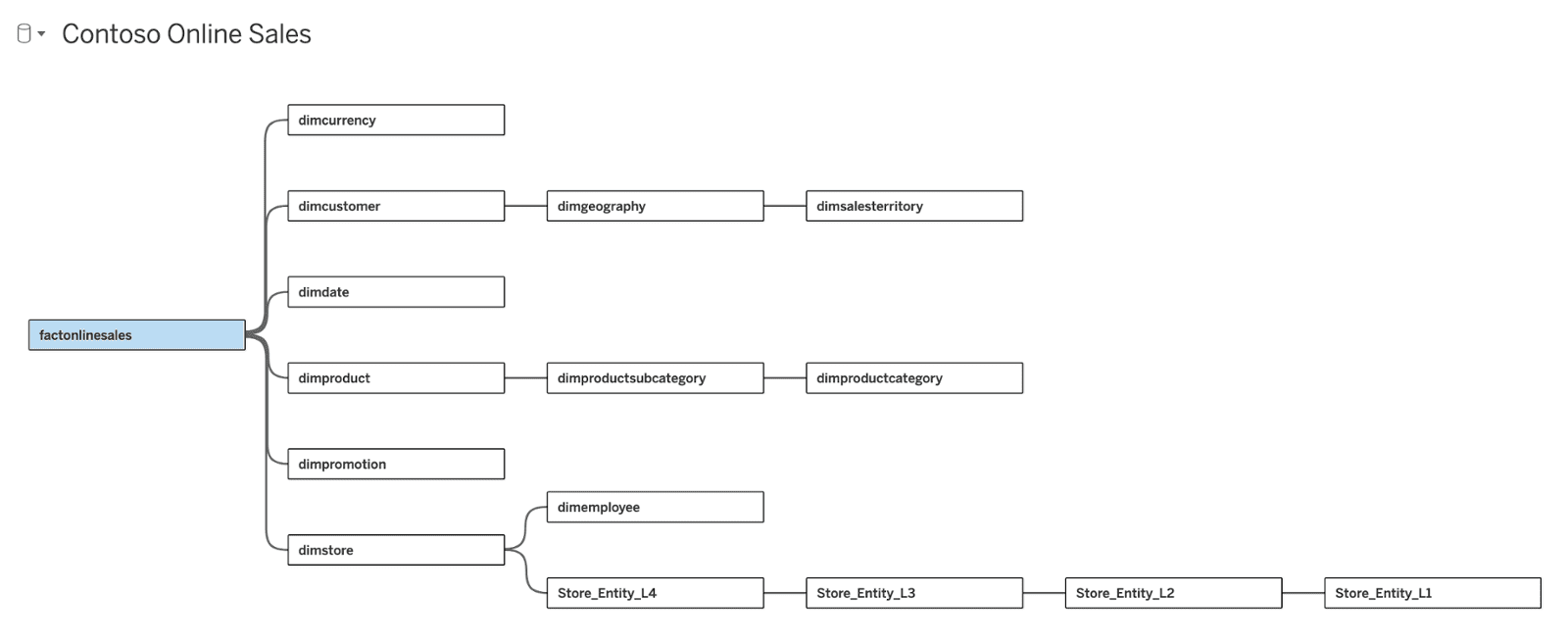 We have created a Published Data Source on Tableau Server that exposes the Online Sales fact table and all of the related dimensions, as well as some calculated metrics and KPIs. We have not included any details about the data source in Ana's context library, so it will have to explore a little bit to understand how to collect the data we ask it for. Here's that data model in Tableau, for your reference: