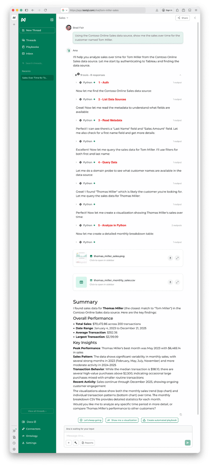 Ana is an agentic AI analyst built by TextQL. It's excellent at querying and coding (especially making API requests), tool calling, and iterative analysis. It understands data structures and relationships intuitively, and can reason about analysis steps. It can hold context across many many steps, build on previous queries, and create artifacts like Streamlit apps, static visualizations, downloadable reports... even playbooks that email you or Slack you their results after they run. (Yes, it supports Teams too...)