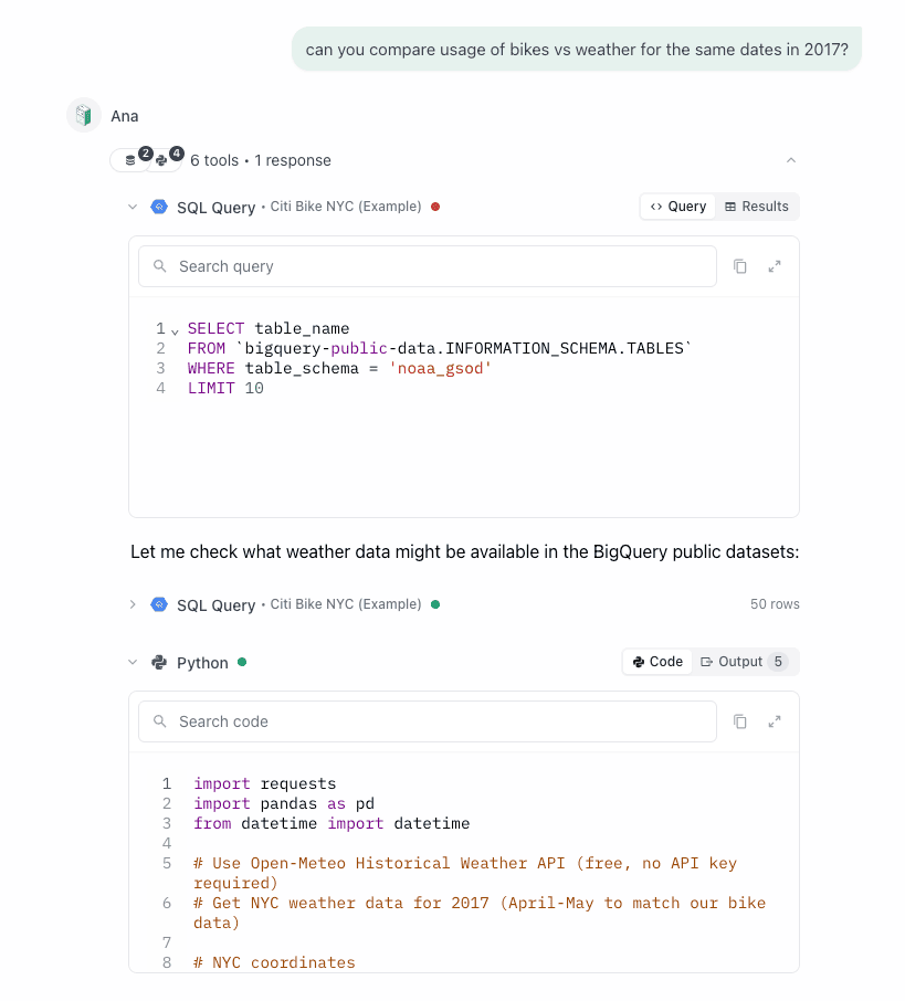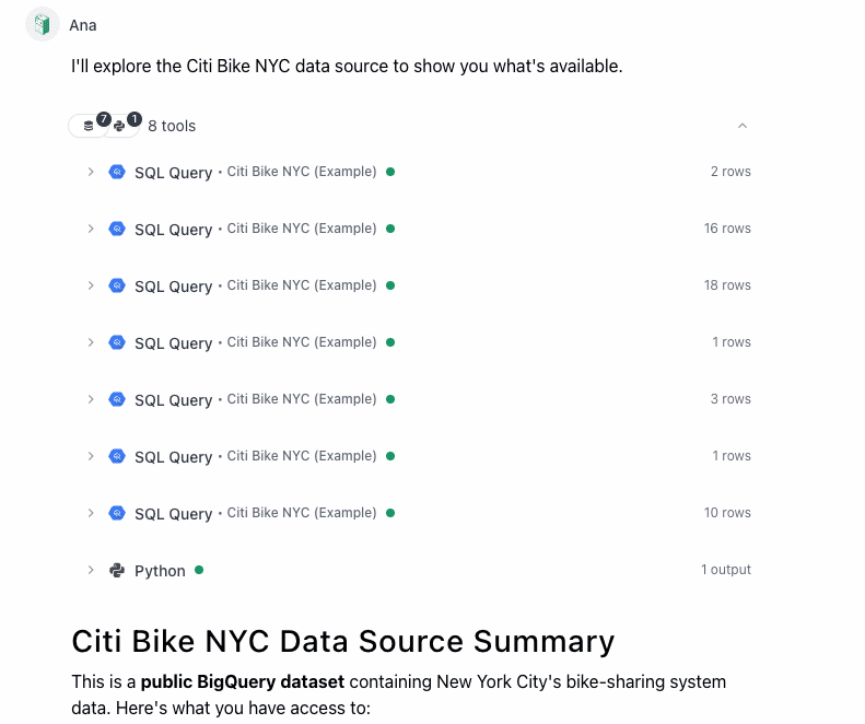 What I love about Ana is that she shows her work, so I can click into any of these steps and see what she was up to. After 7 SQL queries to explore the data, she ran Python to create the output for the summary.