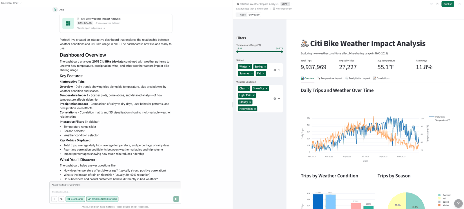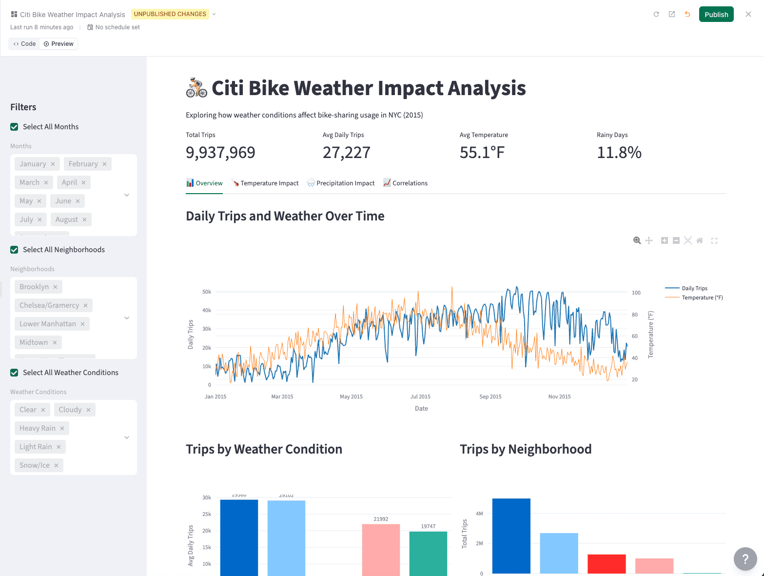 I now have an interactive, multi-tabbed dashboard exploring the impact weather has on the Citi Bike rentals in 2015 (Ana must have chosen that time range for me.)