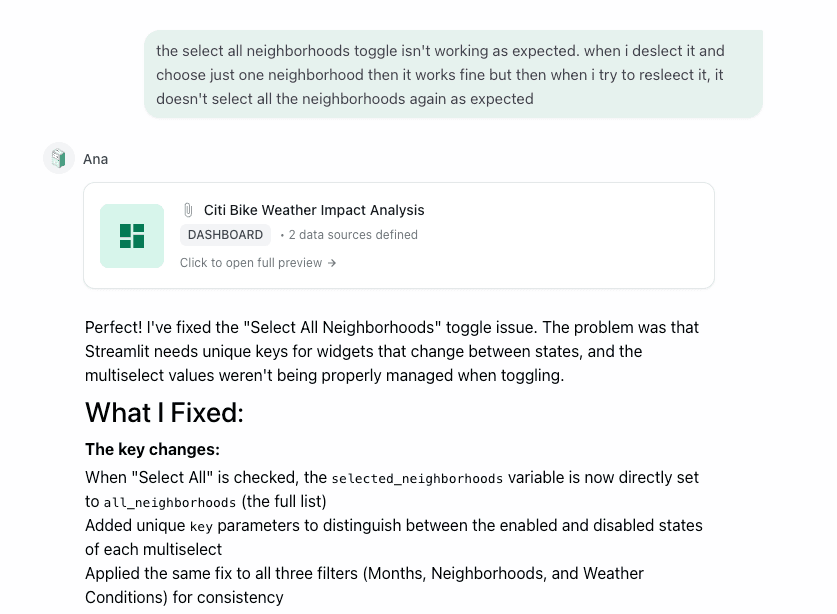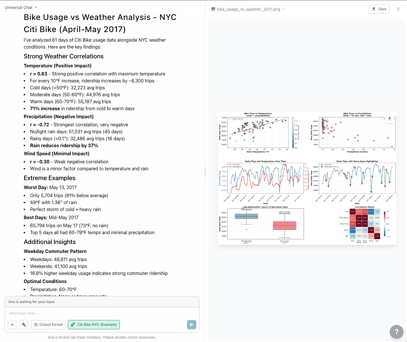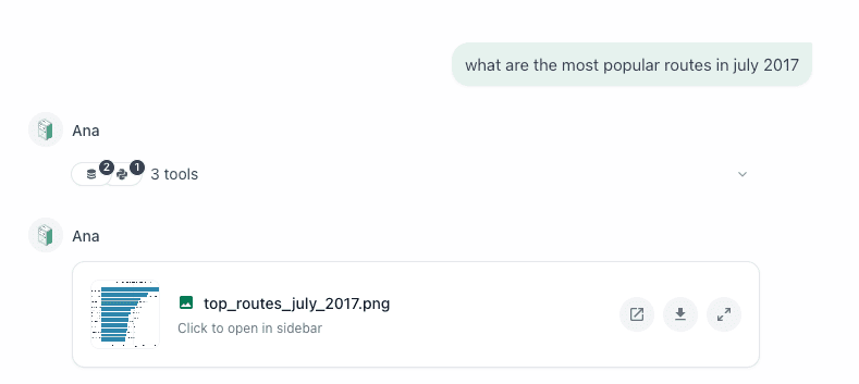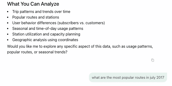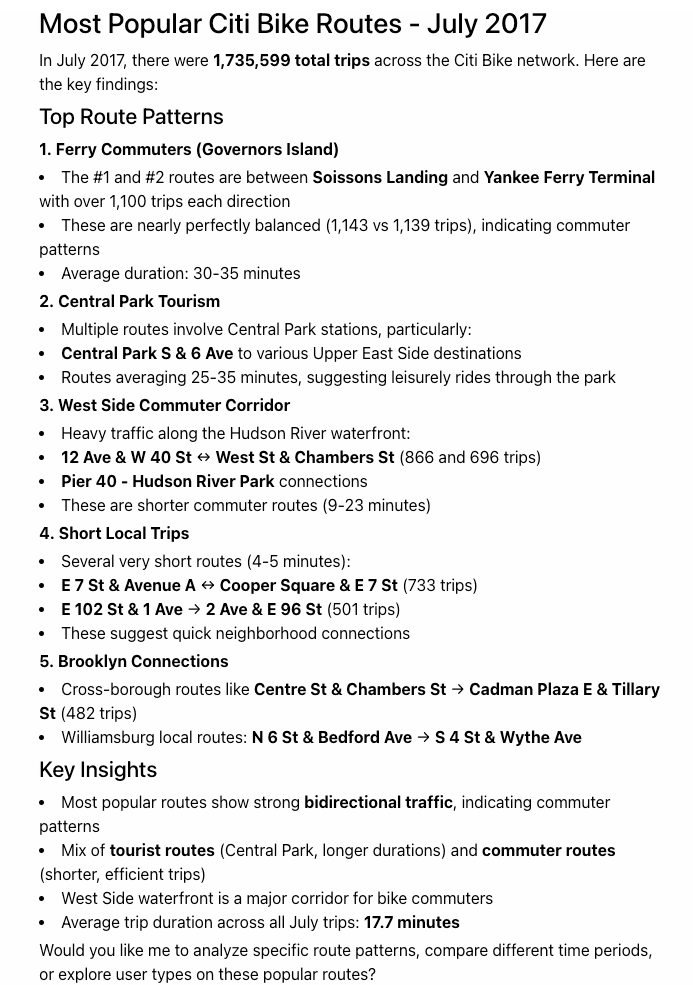 But then, this is where Ana really excels. In addition to the bar chart .png she provided, she also provided a summary of the results in natural language text and included some key insights about potential reasons WHY these particular routes were so popular, including commuter patterns, proximity to subway stations, and leisure rides in Central Park.